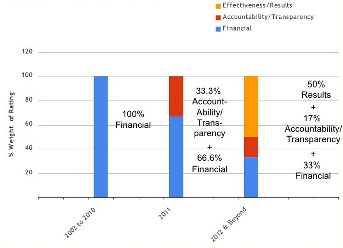 評比方式變動所傳達的真實意義是「財務績效指標」及「透明度」只是過程,未必與「解決問題的效能」直接相關[3]。 更具體地說,「捐款」在未來將更接近「投資」的概念,真正應該關心的是社會投資有沒有達成設定的目標,而目前我們剛開始注意這件事而已。
