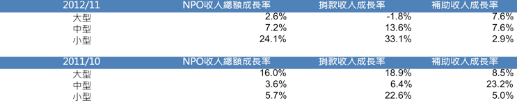 2011年因日本311大地震致捐款短時間內湧入,致2012年大型公益組織捐款收入略微減少。但即便如此,中小型組織在這二年的成長仍相當顯著[4]。