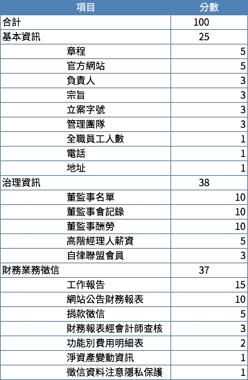 參考美國及中國的透明度指數,我們草擬了類似的責信指數,試圖讓公益組織的透明度及治理情形有更明確的指標,以利分析及區隔。